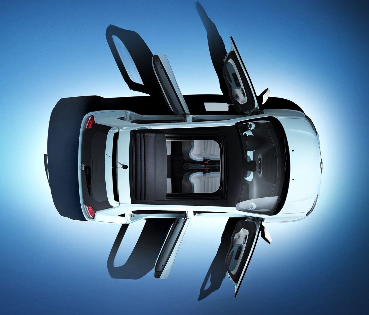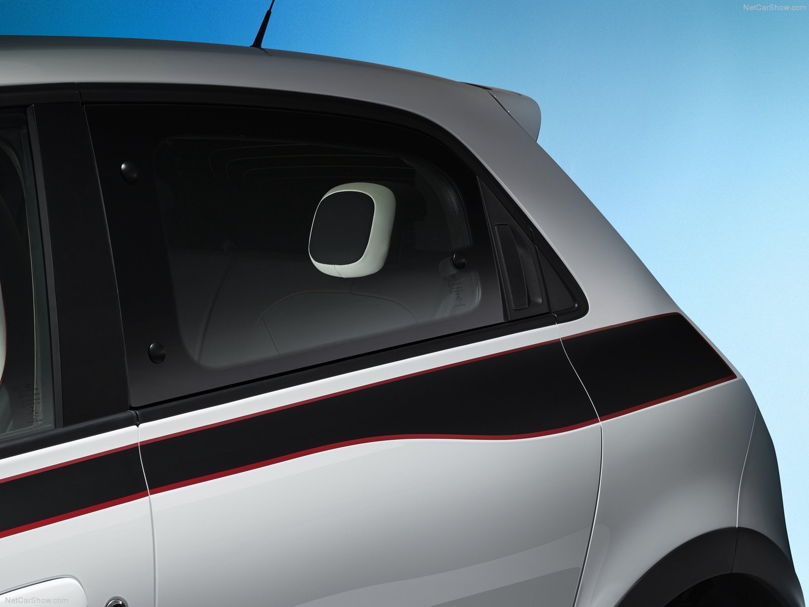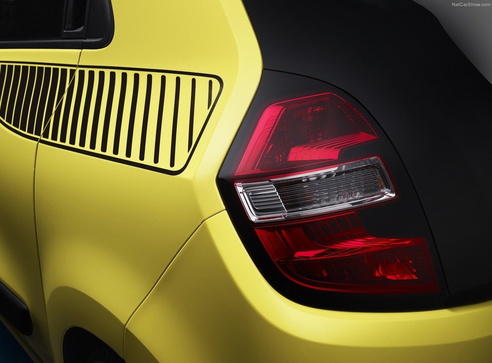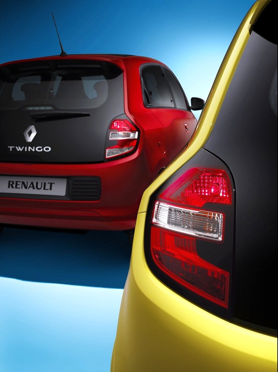 Расположение передней светотехники у Твинго 2015, задний бампер, багажник и четырехсегментные диски. Вид сверху на прозрачную крышу и открытые двери. Вертикально ориентированный задний фонарь, состоящий из 4 сегментов и округлая корма автомобилей с антенной и мини-антикрылом. Замаскированная в оконном проеме ручка задней двери и декоративная продольная полоса на заднем боку. Изображения кликабельны.