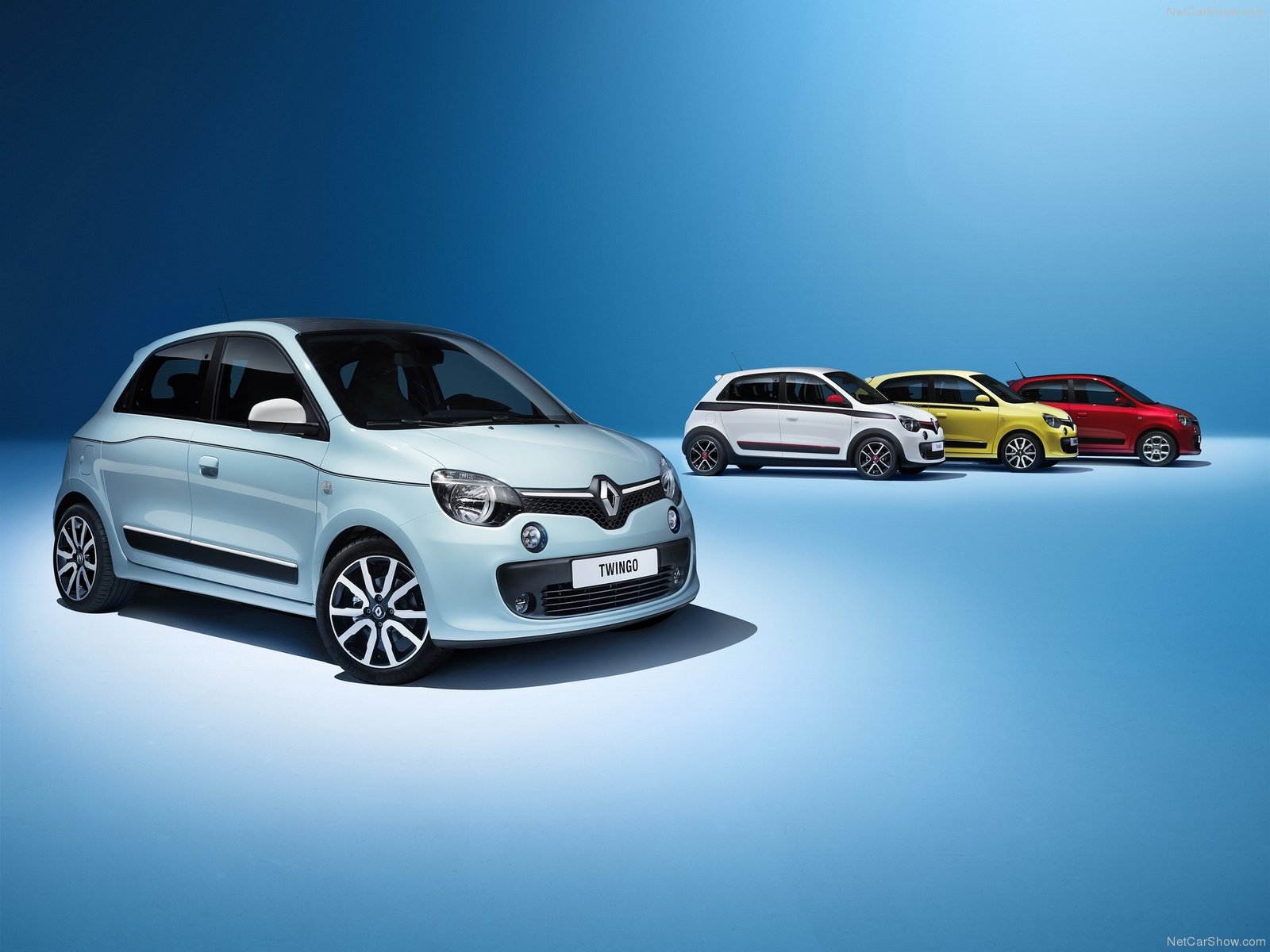 Фото городского минимобиля Renault Twingo 2015. Пастельная цветовая палитра компактного Рено Твинго 2015: 4 машины на любой вкус и дизайн. Модный Твинго с черно-красной полосой по периметру. Хищный прищур передних фар и светоотражателей. Оптимистично бодрый желтый экземпляр и сине-зеленый вариант окраски с параллельными линиями. Боковой ракурс с французским коротышом. Серый, светло-голубой, красный и желтый автомобили.